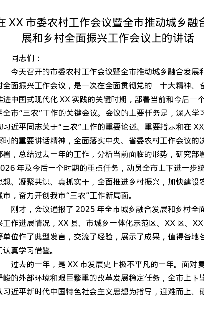 在XX市委农村工作会议暨全市推动城乡融合发展和乡村全面振兴工作会议上的讲话