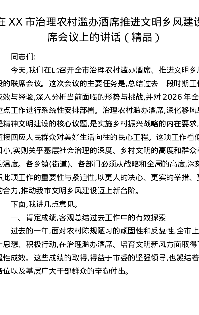 在XX市治理农村滥办酒席推进文明乡风建设联席会议上的讲话