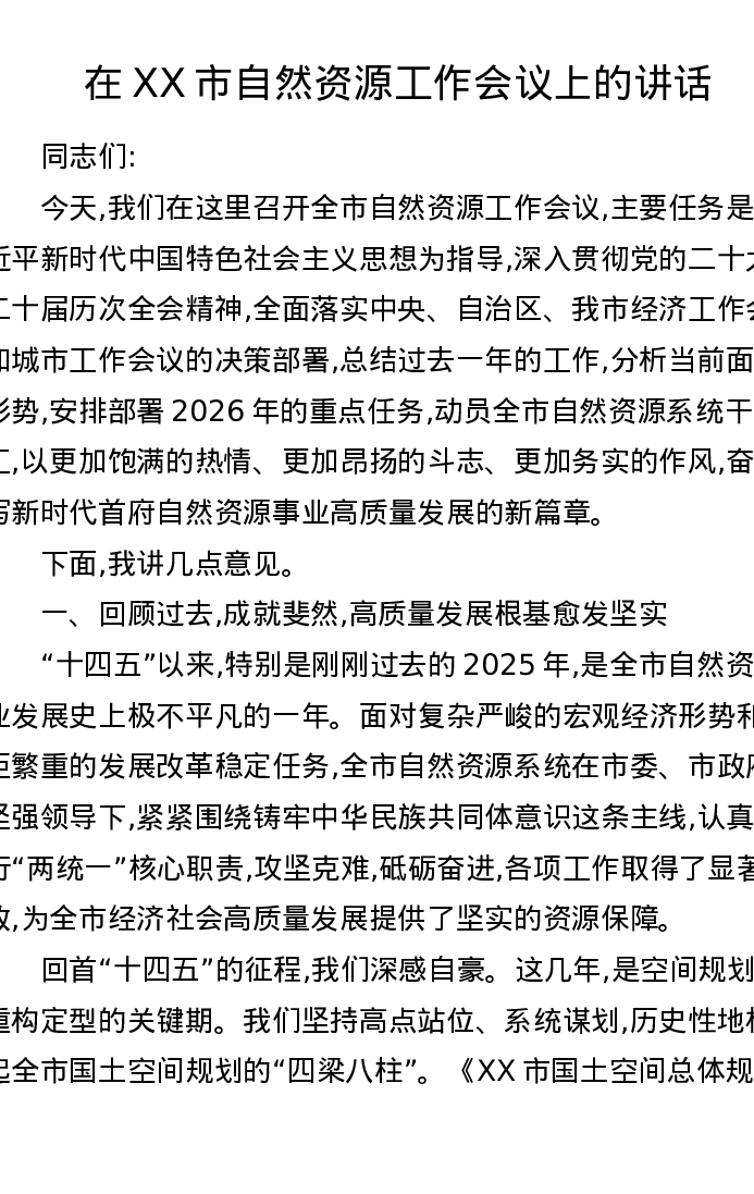 在XX市自然资源工作会议上的讲话