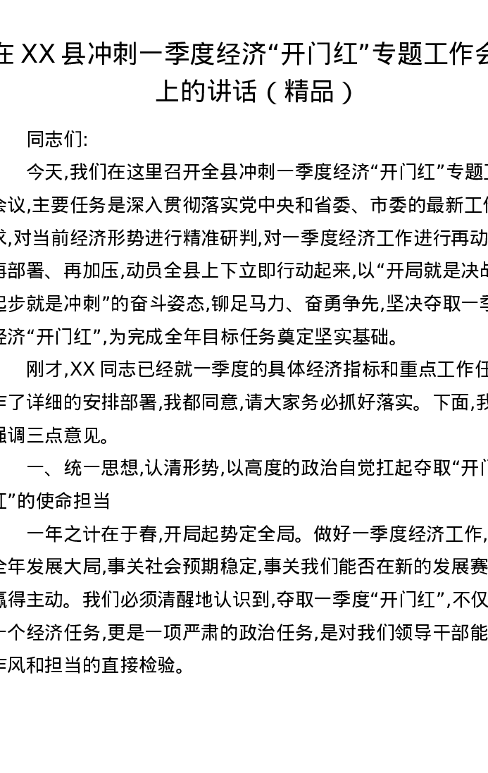 在XX县冲刺一季度经济开门红专题工作会议上的讲话