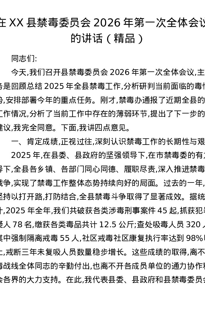 在XX县禁毒委员会2026年第一次全体会议上的讲话