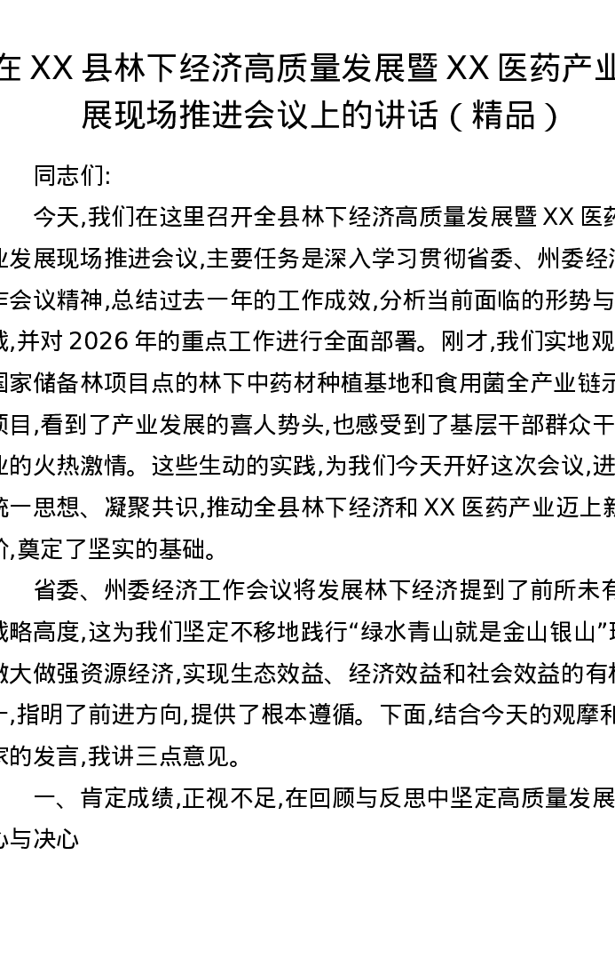 在XX县林下经济高质量发展暨XX医药产业发展现场推进会议上的讲话
