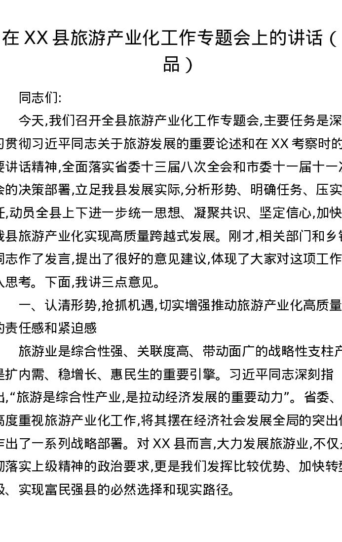 在XX县旅游产业化工作专题会上的讲话