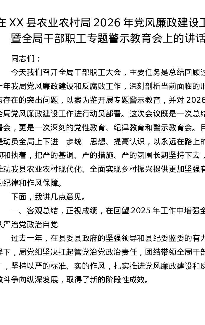在XX县农业农村局2026年党风廉政建设工作暨全局干部职工专题警示教育会上的讲话