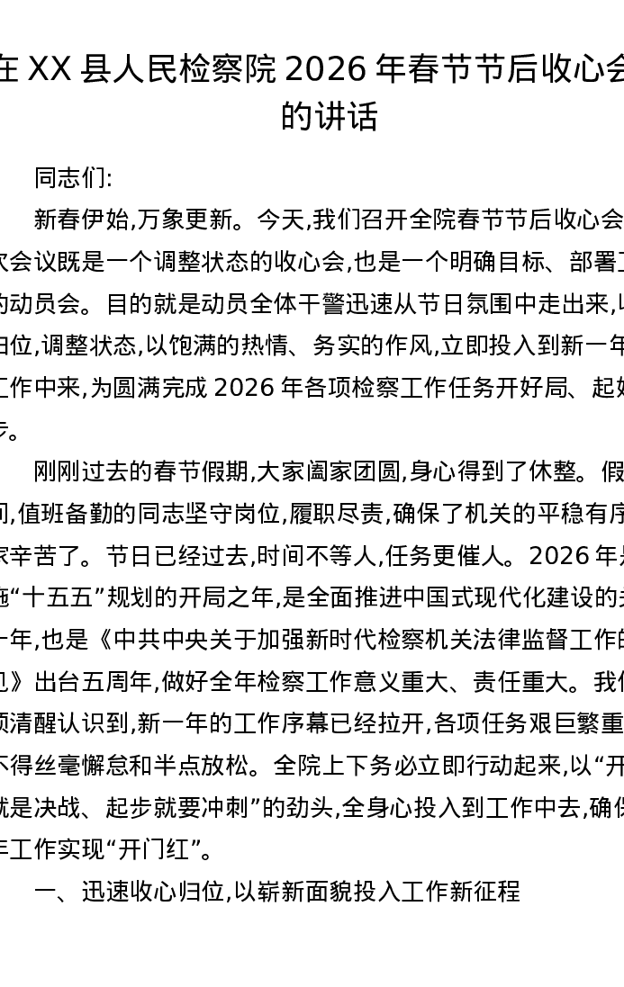 在XX县人民检察院2026年春节节后收心会上的讲话