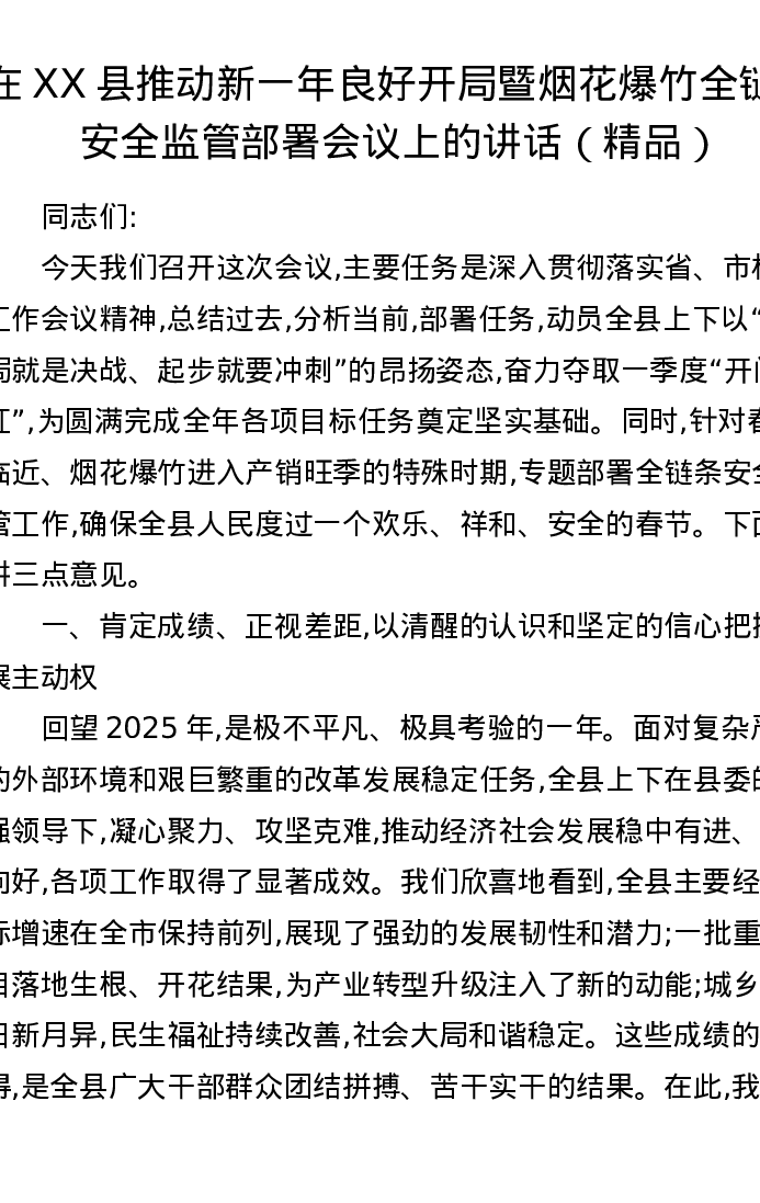 在XX县推动新一年良好开局暨烟花爆竹全链条安全监管部署会议上的讲话