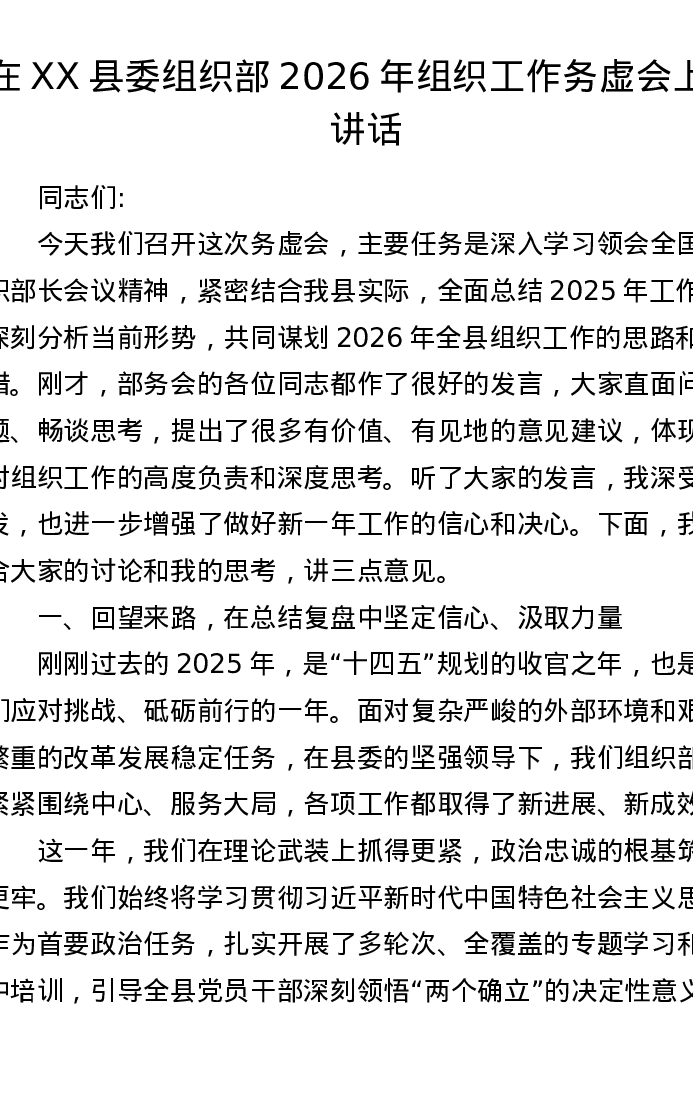 在XX县委组织部2026年组织工作务虚会上的讲话