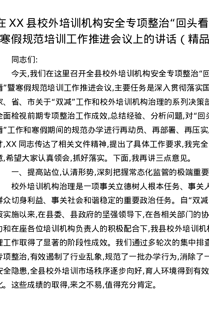 在XX县校外培训机构安全专项整治回头看暨寒假规范培训工作推进会议上的讲话