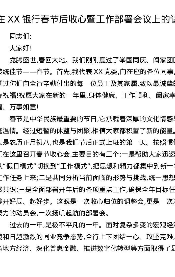 在XX银行春节后收心暨工作部署会议上的讲话