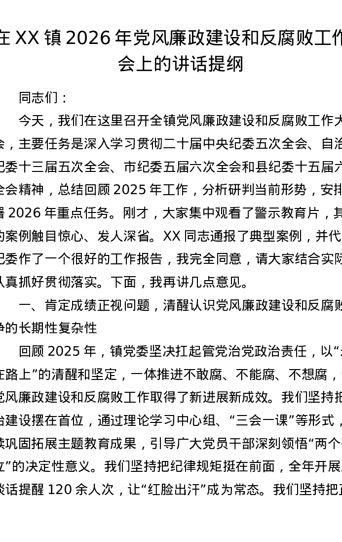 在XX镇2026年党风廉政建设和反腐败工作大会上的讲话提纲