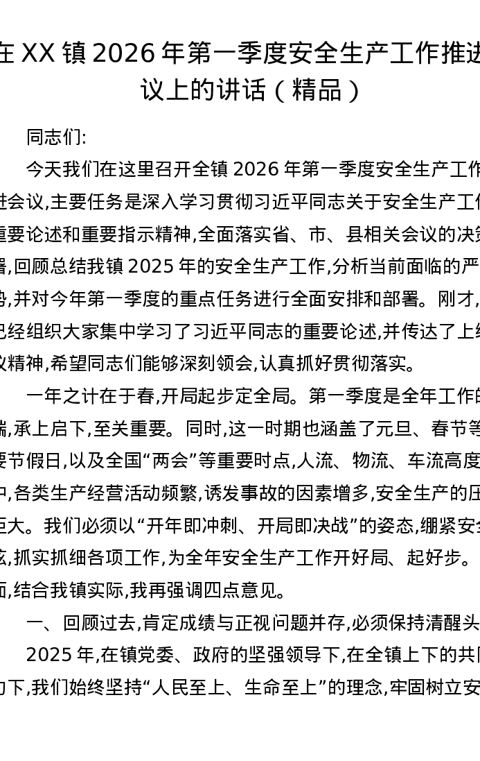 在XX镇2026年第一季度安全生产工作推进会议上的讲话