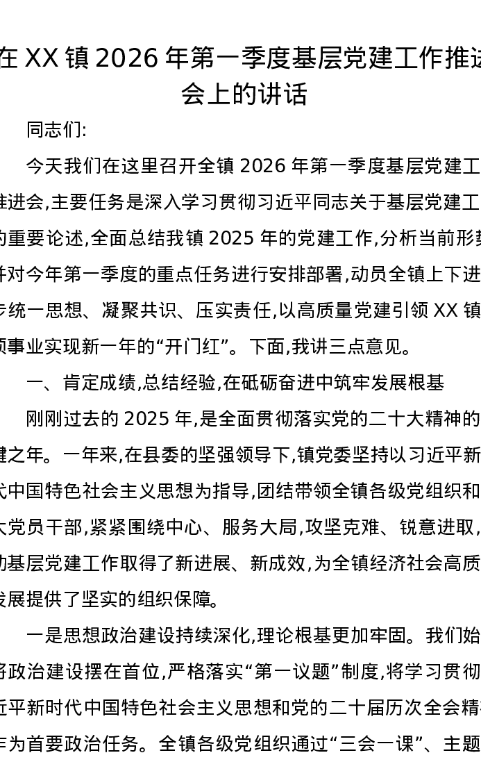 在XX镇2026年第一季度基层党建工作推进会上的讲话-1