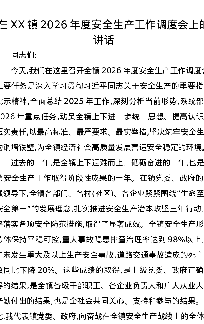 在XX镇2026年度安全生产工作调度会上的讲话