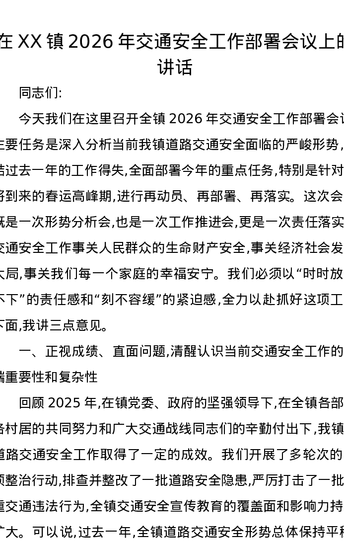 在XX镇2026年交通安全工作部署会议上的讲话