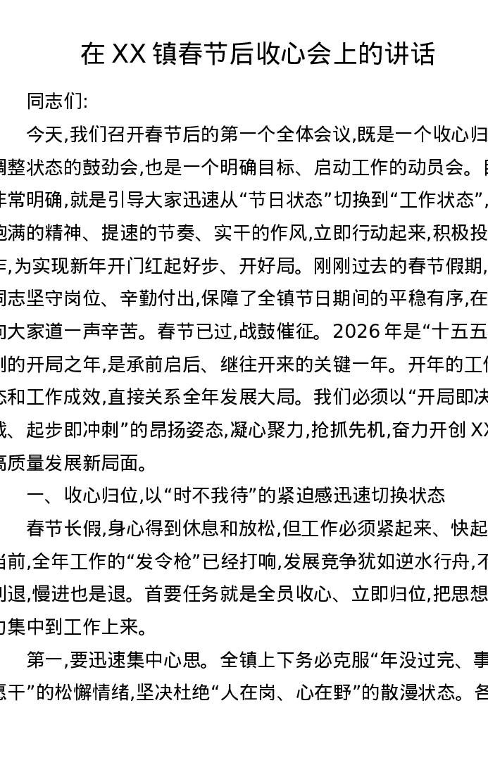 在XX镇春节后收心会上的讲话