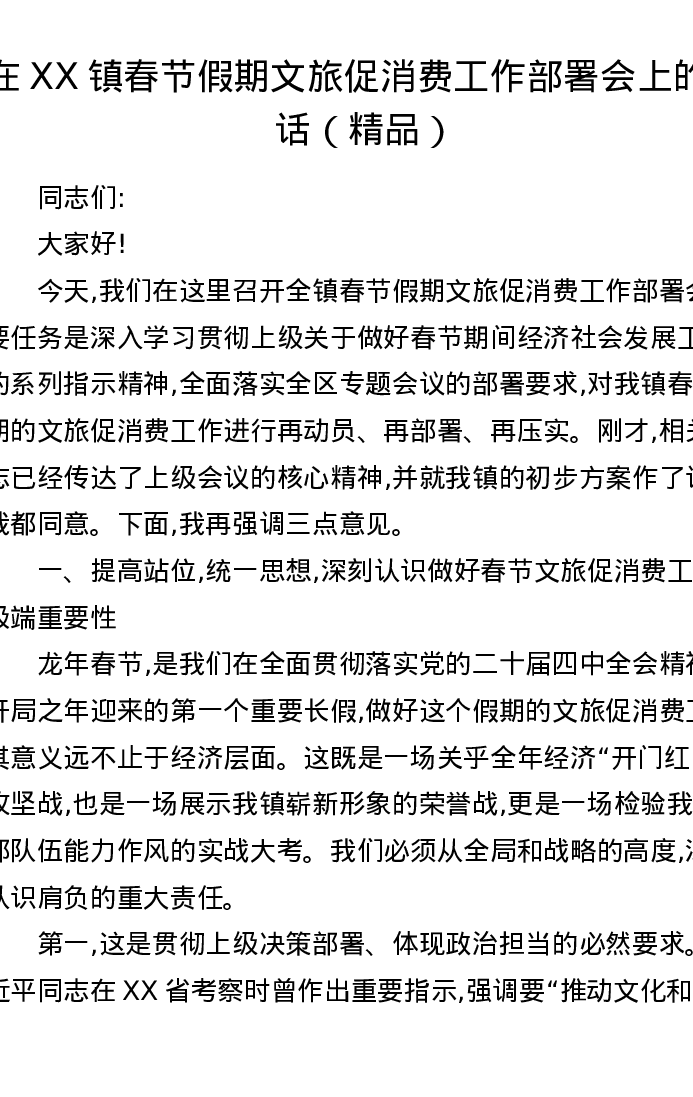 在XX镇春节假期文旅促消费工作部署会上的讲话