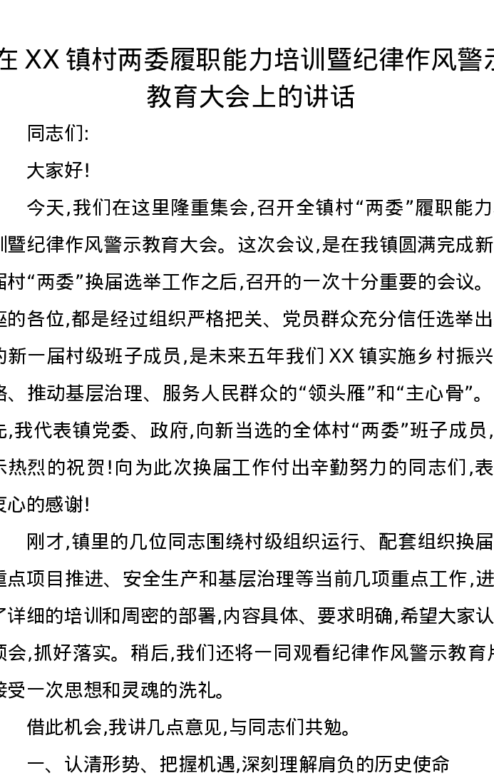 在XX镇村两委履职能力培训暨纪律作风警示教育大会上的讲话