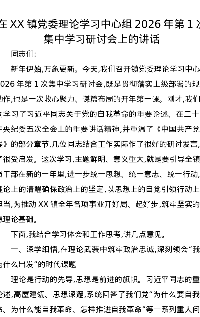 在XX镇党委理论学习中心组2026年第1次集中学习研讨会上的讲话