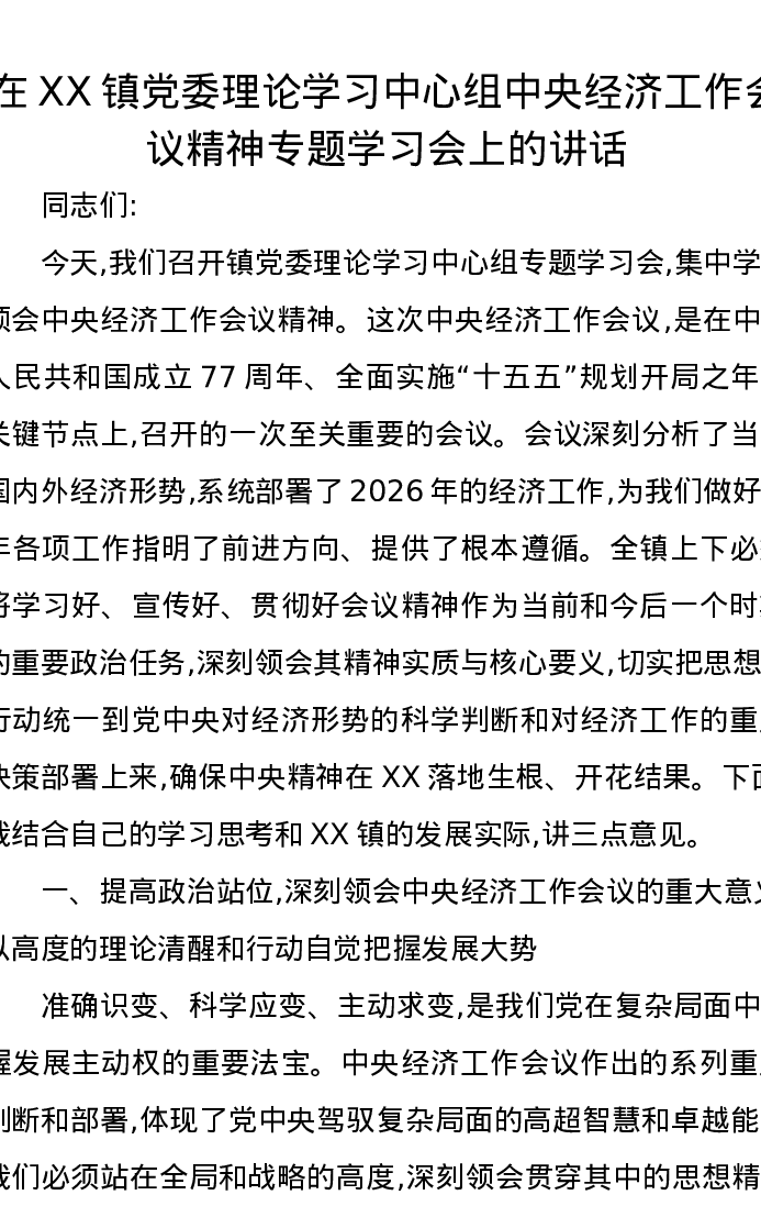 在XX镇党委理论学习中心组中央经济工作会议精神专题学习会上的讲话