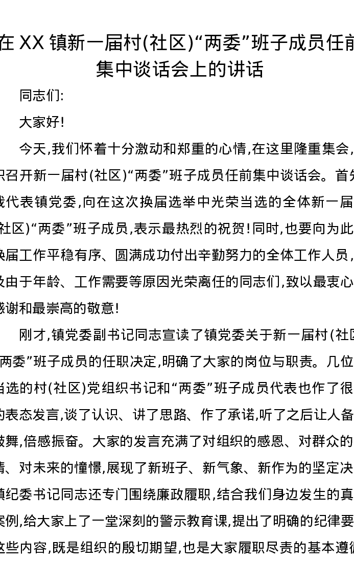 在XX镇新一届村(社区)两委班子成员任前集中谈话会上的讲话