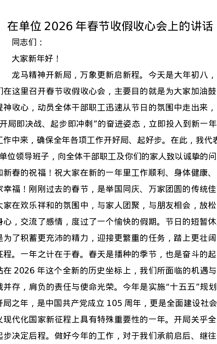 在单位2026年春节收假收心会上的讲话