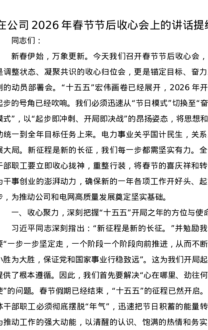在公司2026年春节节后收心会上的讲话提纲