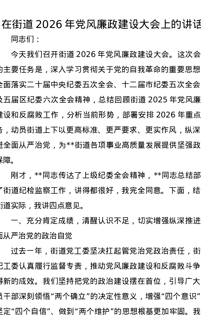 在街道2026年党风廉政建设大会上的讲话