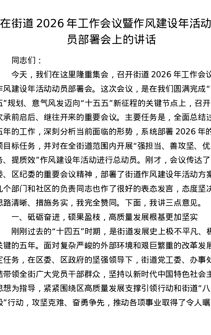 在街道2026年工作会议暨作风建设年活动动员部署会上的讲话