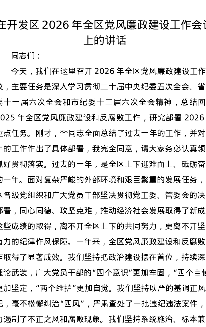 在开发区2026年全区党风廉政建设工作会议上的讲话