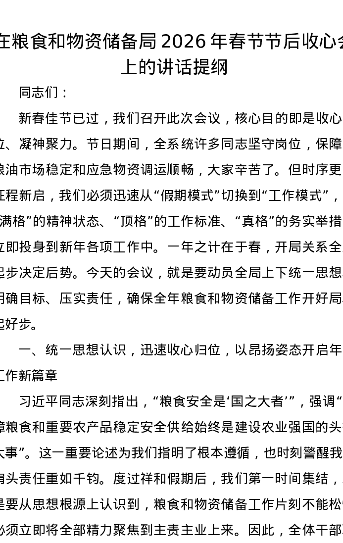 在粮食和物资储备局2026年春节节后收心会上的讲话提纲