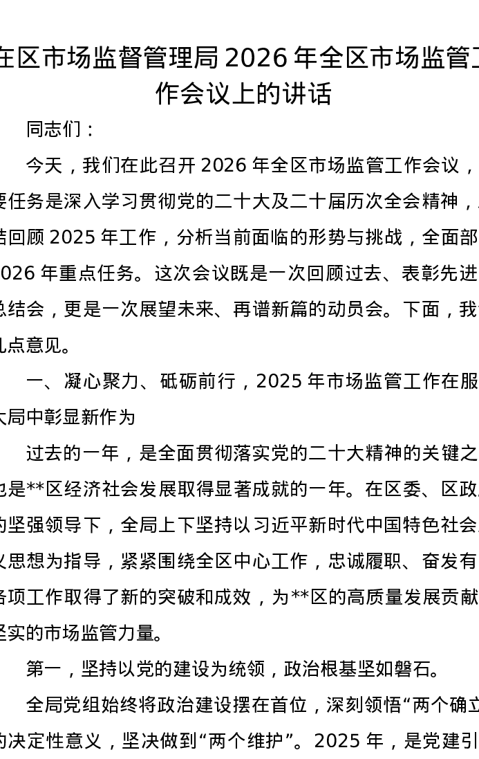 在区市场监督管理局2026年全区市场监管工作会议上的讲话