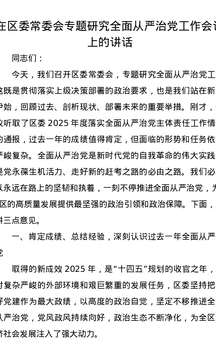 在区委常委会专题研究全面从严治党工作会议上的讲话