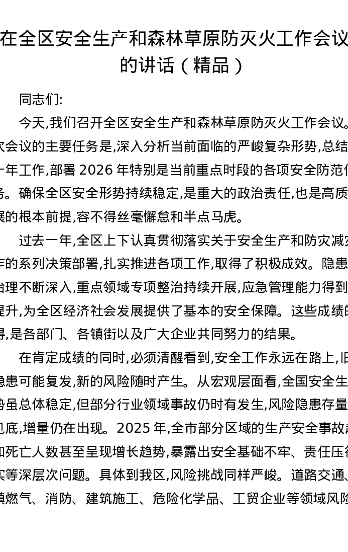 在全区安全生产和森林草原防灭火工作会议上的讲话