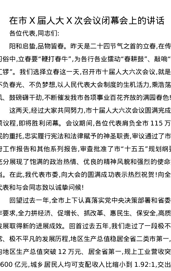 在市X届人大X次会议闭幕会上的讲话
