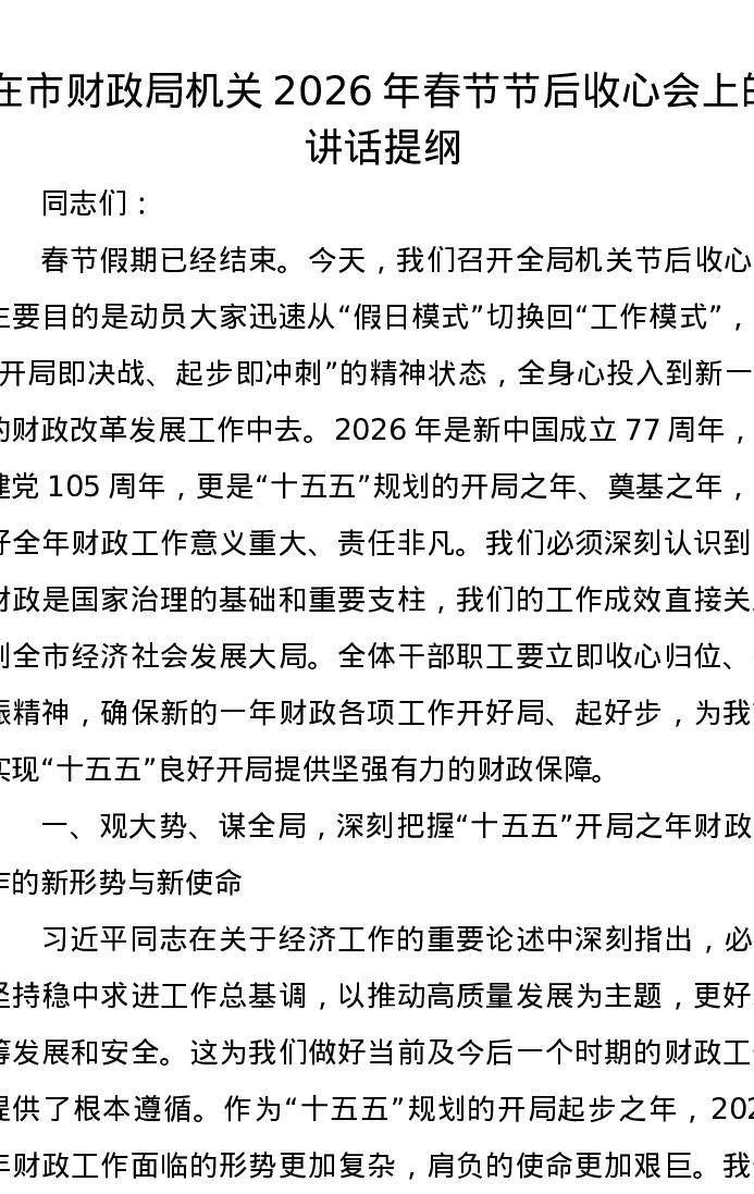 在市财政局机关2026年春节节后收心会上的讲话提纲