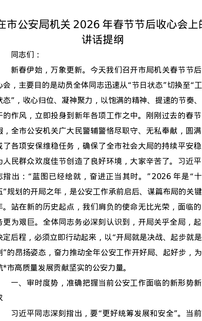在市公安局机关2026年春节节后收心会上的讲话提纲