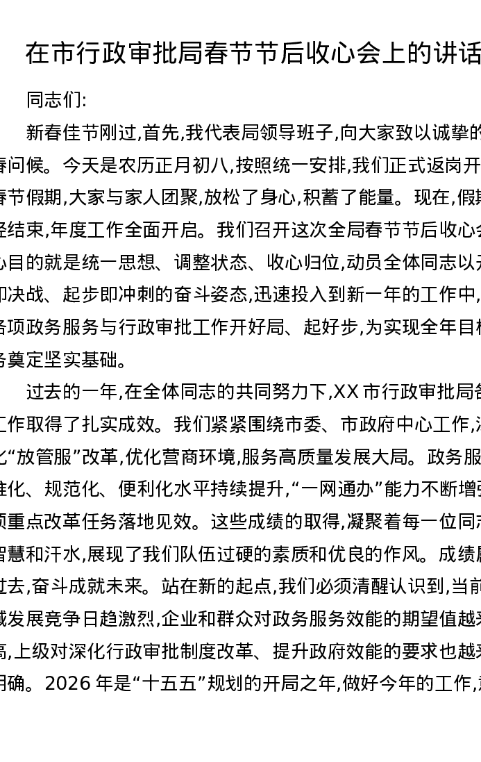 在市行政审批局春节节后收心会上的讲话