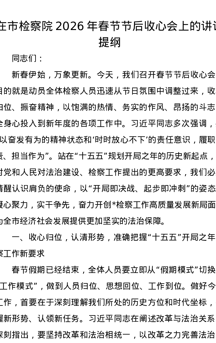 在市检察院2026年春节节后收心会上的讲话提纲