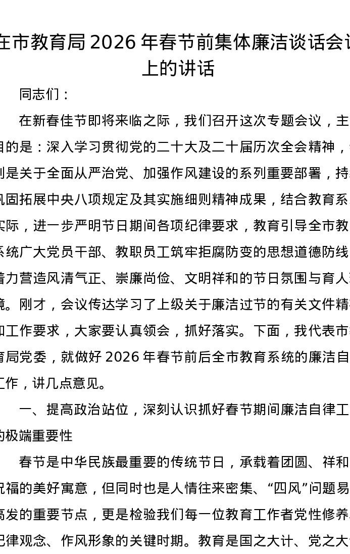 在市教育局2026年春节前集体廉洁谈话会议上的讲话