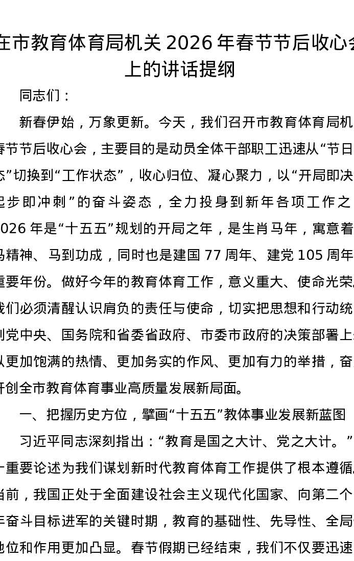 在市教育体育局机关2026年春节节后收心会上的讲话提纲