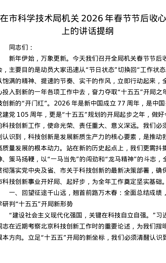 在市科学技术局机关2026年春节节后收心会上的讲话提纲