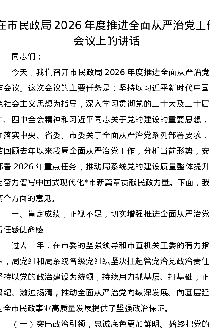 在市民政局2026年度推进全面从严治党工作会议上的讲话