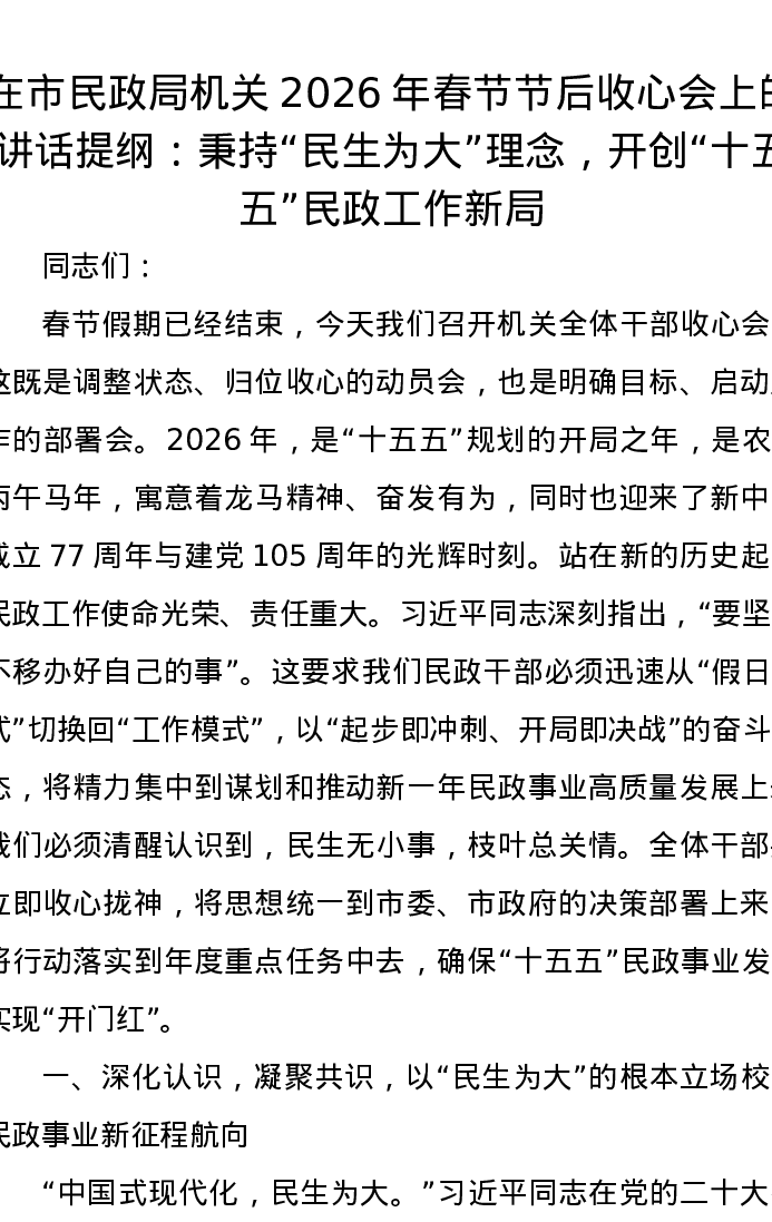 在市民政局机关2026年春节节后收心会上的讲话提纲:秉持民生为大理念,开创十五五民政工作新局