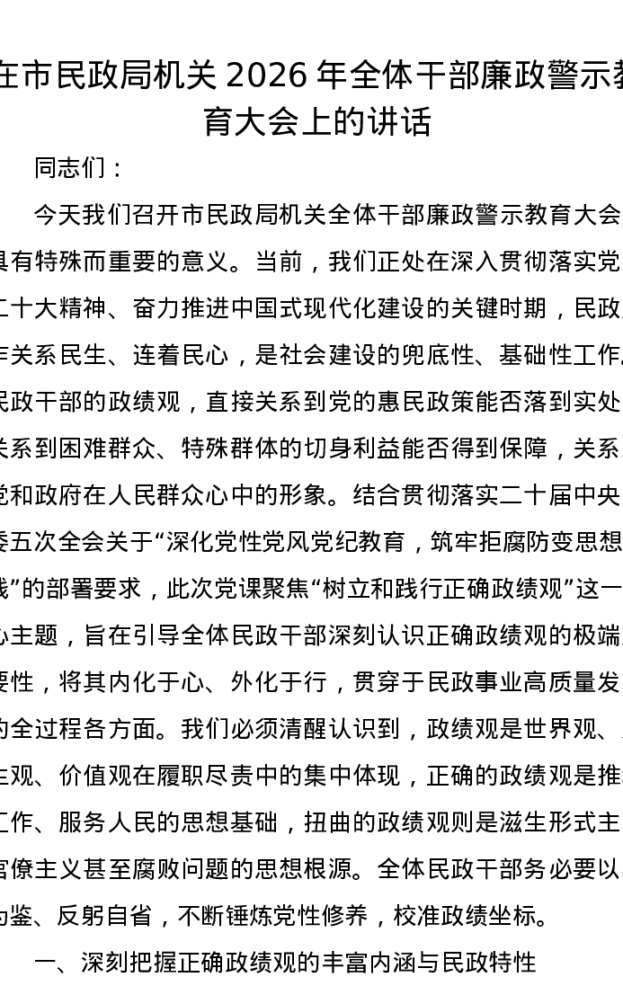 在市民政局机关2026年全体干部廉政警示教育大会上的讲话