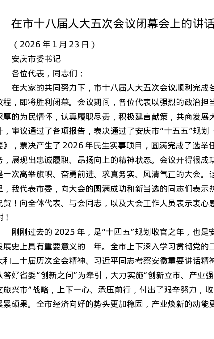 在市十八届人大五次会议闭幕会上的讲话