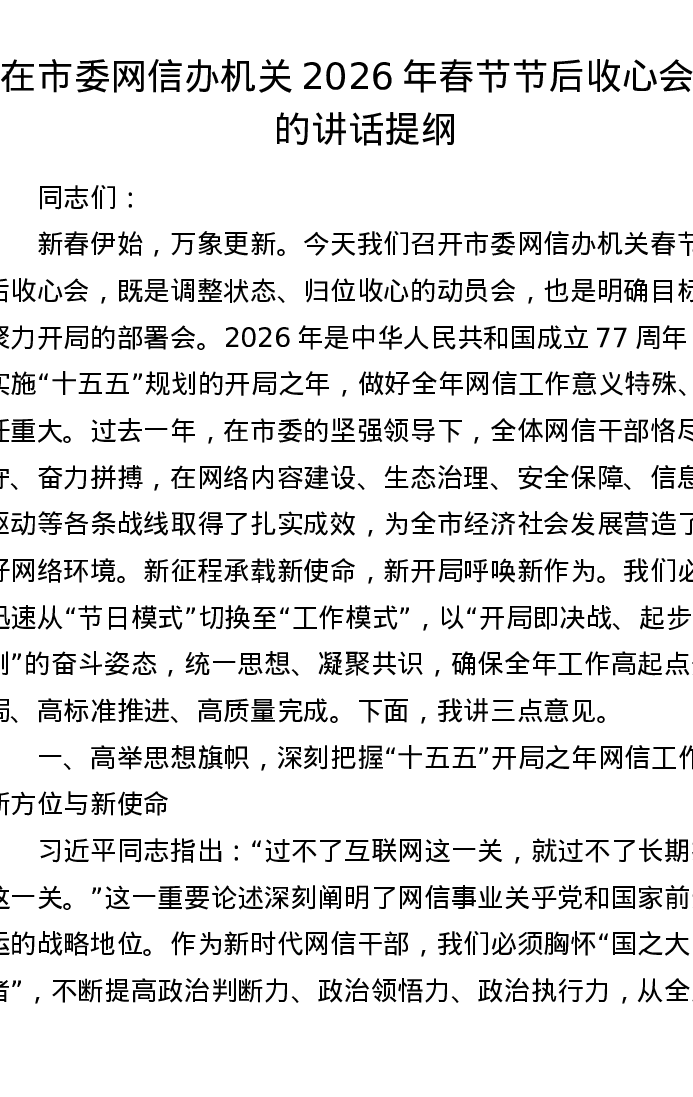 在市委网信办机关2026年春节节后收心会上的讲话提纲