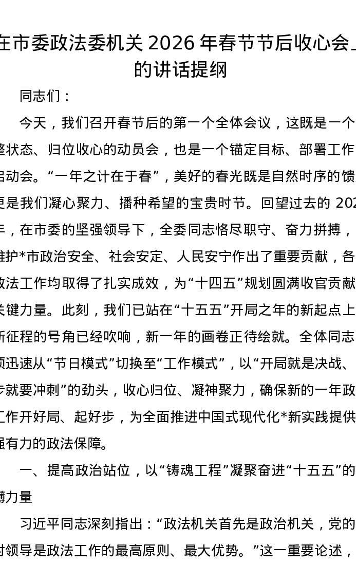 在市委政法委机关2026年春节节后收心会上的讲话提纲