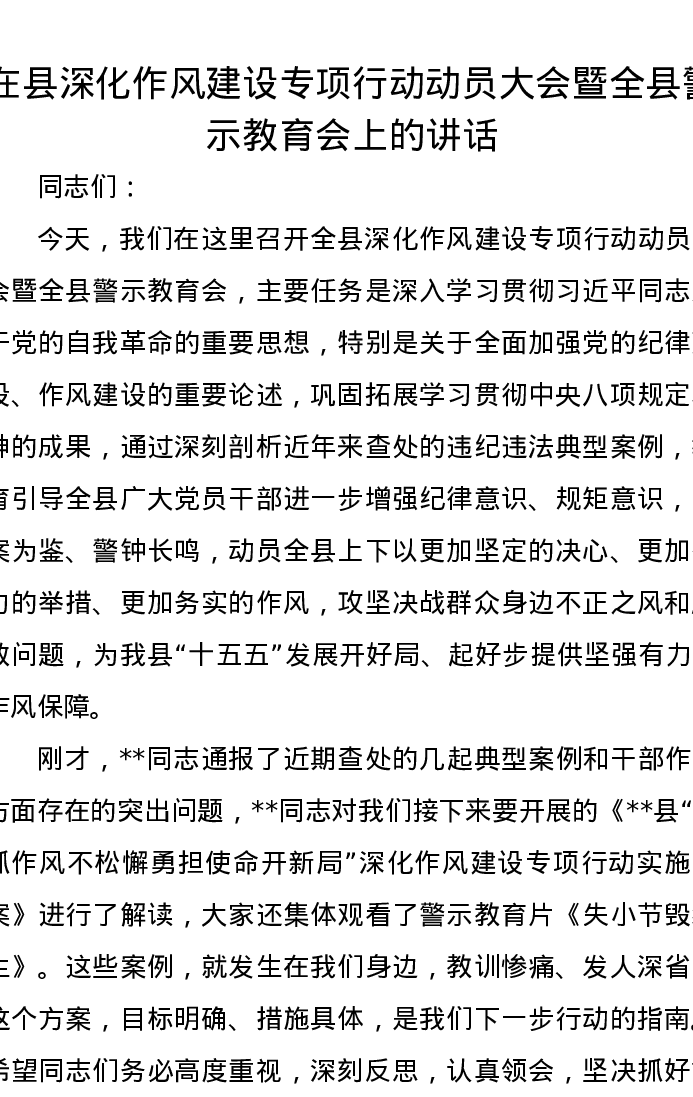 在县深化作风建设专项行动动员大会暨全县警示教育会上的讲话