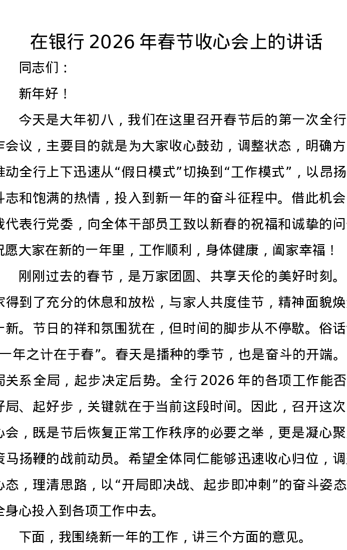 在银行2026年春节收心会上的讲话