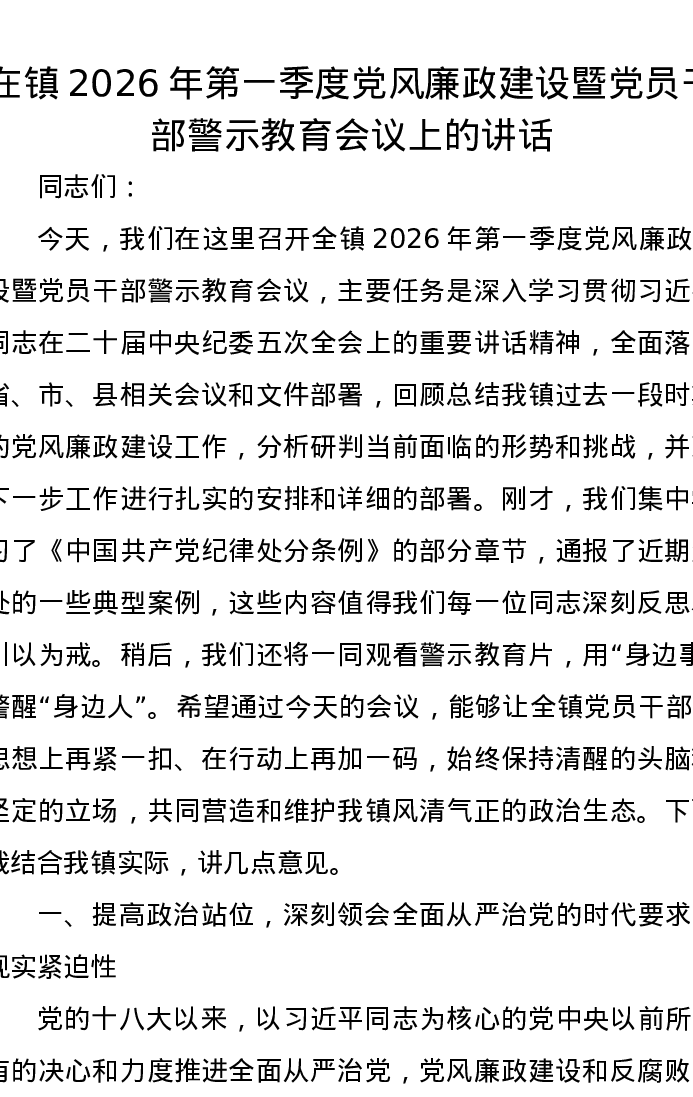 在镇2026年第一季度党风廉政建设暨党员干部警示教育会议上的讲话